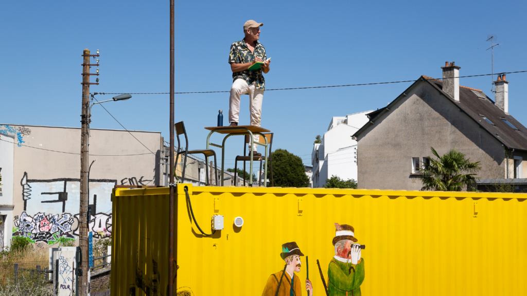 Le public est invité à attendre une personne, « le gars », qui arrive avec sa porte devant laquelle il va attendre avec nous.